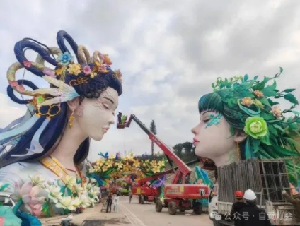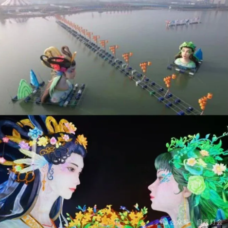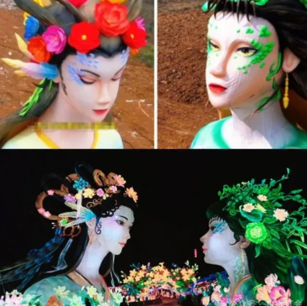 创作融合传统工艺与现代科技——设计师首创作具有中国韵味的女性形象雏形,灯会主办方国投集团华荟公司设计团队结合影视CG美学对3D模型的脸型、五官及发型反复优化,确保既符合神话角色特征又契合现代审美。百余名工匠以传统丝架造型结合数字建模技术,历时近两月完成立体转化。备受争议的制作难点集中于巨型头像的妆容呈现:团队从700余张妆造图中精选设计方案,因头像规模导致的透视变形、布匹裱肤材质限制,整个制灯过程仅有一次上妆机会且无法修改,使妆容难度远超造型阶段。美工团队凭借极致匠心,依托三台工程车高空协作,耗时7天以丙烯颜料精准完成零容错绘制,最终成就展现自贡彩灯顶尖工艺水准的典范之作。追求。